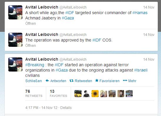 Drei Minuten nach der Kriegserklärung via Twitter verkündete die israelische Armeesprecherin Avital Leibovich, dass man den Chef des bewaffneten Arms der in Gaza herrschenden Hamas, Ahmed al-Jabari, mit einer Rakete auf sein fahrendes Auto getötet habe. Sofort veröffentlichte die israelische Armee über ihrem Youtube-Kanal eine Luftaufnahme dieses Raketenangriffes, die bis zum 20. November über 4 Millionen Mal angeklickt wurde.