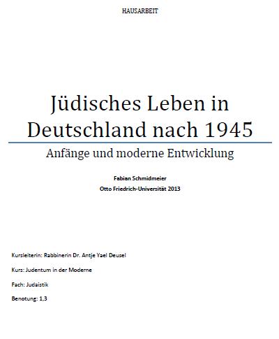1945 – Die „Stunde Null“. Deutschland und Europa liegen in Trümmern, Millionen von Menschen sind getötet worden und die Überlebenden und Hinterbliebenen versuchen mit einfachsten Mitteln den Alltag zu meistern. Vor allem die jüdischen Überlebenden der Schoa, des industriellen Massenmordes durch die Nationalsozialisten, hofften im neu entstehenden Staat Israel, im Orient, eine neue Heimat zu finden. Viele Kibbutzim entstanden aber nicht im bis dato britischen Mandatsgebiet, sondern in der Fränkischen Schweiz. Während zahlreiche Juden schließlich tatsächlich auswanderten, blieben andere in Deutschland und fanden hier eine neue Heimat. Aus Provisorien wurden neue Gemeinden und ein fester Bestandteil der Bundesrepublik Deutschland. Über diese und andere Entwicklungen jüdischen Lebens in Deutschland und dem Verhältnis der deutschen Juden zum Staat Israel handelt folgende wissenschaftliche Arbeit Jüdisches Leben in Deutschland nach 1945 – Anfänge und moderne Entwicklung.